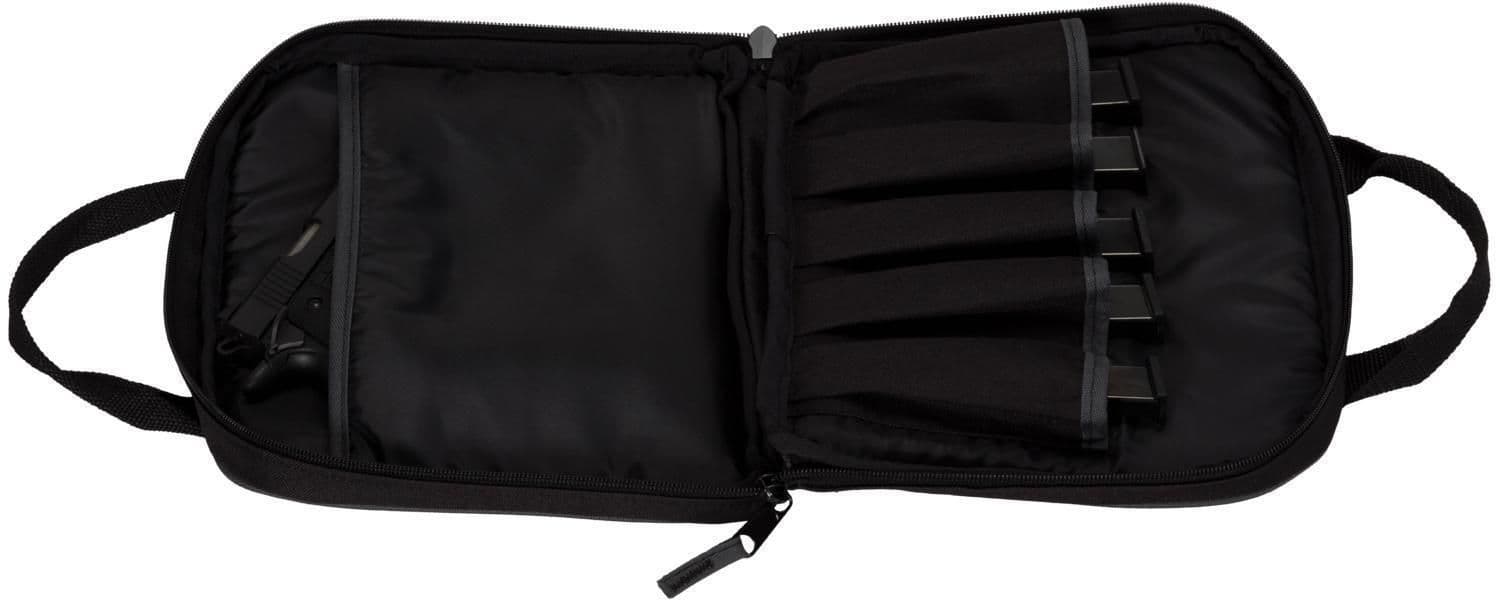Special features single pistol case has one interior pocket and five magazine storage slots, wide exterior pocket with hook and loop closures for smaller flat items • firearms and accessories shown not included