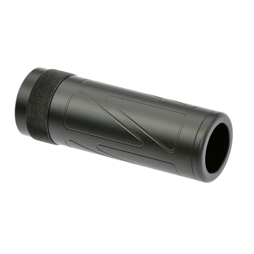Made of a durable aluminium alloy, it resembles firearm suppressors with its black finish and precisely engraved lines.